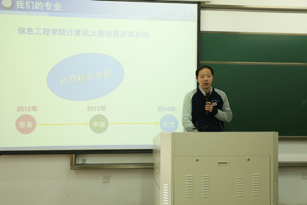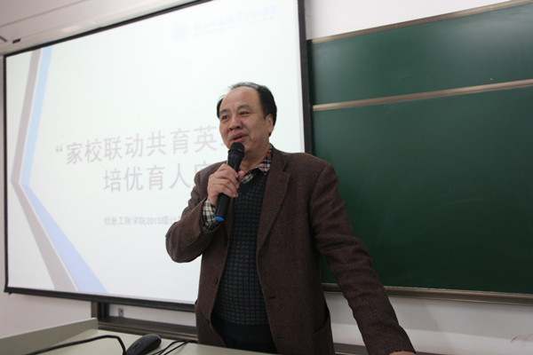 信息工程学院院长杨悦梅介绍了学院近年来的发展情况。她指出,计算机大类招生分类培养是学院适应省、市信息经济发展需求,尊重学生个性化发展的重要举措,希望家长多与子女、老师沟通,实现家校联动育人。信息工程学院党总支书记傅联云介绍了学生思想方面的情况,并希望家长能与学校一同培养学生,让他们树立远大的理想。副院长吴龙详细解读了分流方案和实施细则,并从改革发展历程、各专业方向定位及培养目标、各专业方向校企合作及就业前景、分流计划实施进度等方面向家长介绍了分流工作情况。