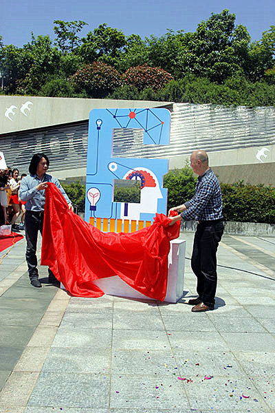 学生处处长汪灿祥、艺术学院副院长王振华为本届文化节吉祥物“艺术芯”揭幕。吉祥物“艺术芯”以SD储存卡和阿拉伯数字6为原型,体现了在“互联网+”的时代里艺术和现代科技的创意结合。