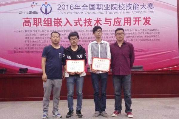 5月8日至9日,2016年全国职业院校技能大赛“嵌入式技术与应用开发(嵌入式产品应用开发)”赛项比赛在天津电子信息职业技术学院举行。在庞家成、王德成两位老师指导下,由我校信息工程学院物联网2013级沈帅帅和移动互联2014级唐张金同学组成的浙江一队,经过努力拼搏最终荣获大赛二等奖。