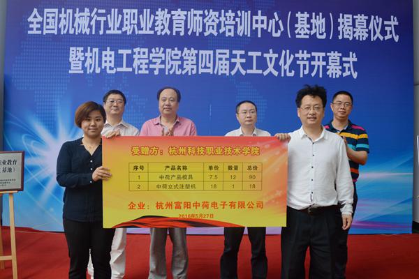 开幕式上,杭州富阳中荷电子有限公司总经理许青向我校捐赠了一台立式注塑机和十二副模具。许青表示,此次捐赠是校企合作的一部分,今后公司将与学校共同探索“基地建设、课程研发、师资培养、培训认证、招生就业”五位一体的校企合作新模式,不断创新合作内容,拓展合作空间。张小红对杭州富阳中荷电子有限公司的捐赠表示感谢,并指出,公司捐助的机床和模具有助于提高模具及相关专业的教学质量,能进一步促进学生专业实践课程中操作技术的掌握。