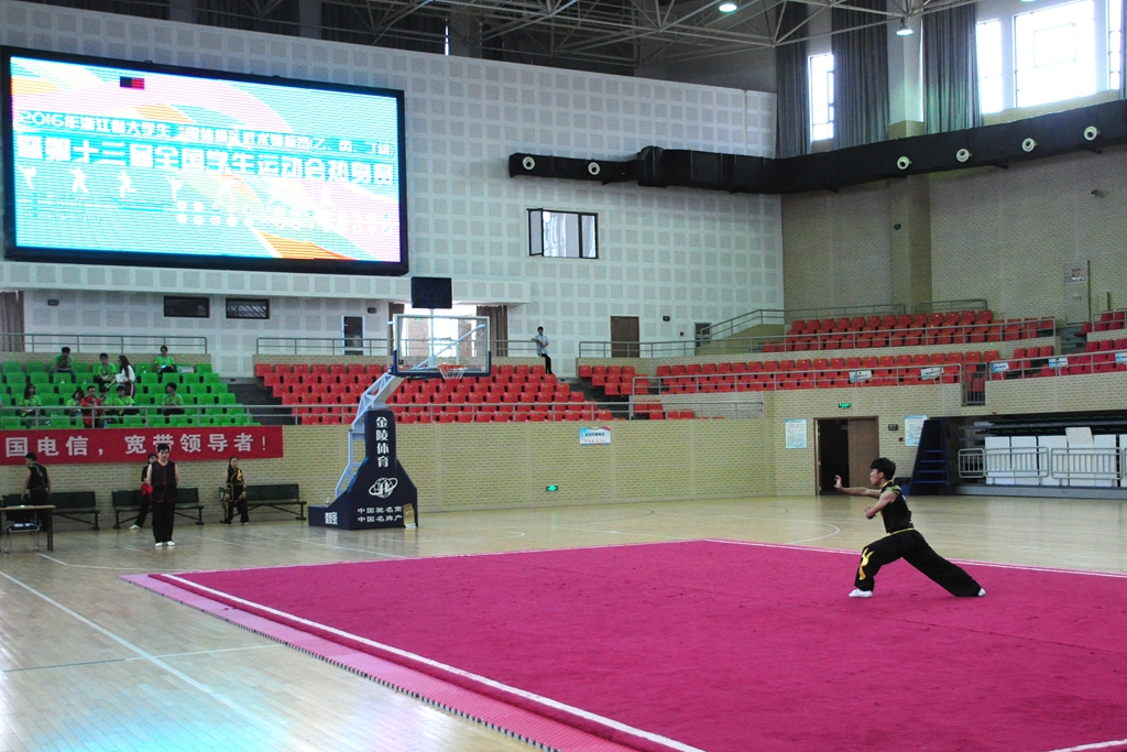 6月4日,2016年浙江省大学生武术锦标赛暨全国第十三届学生运动会热身赛在我校文体中心篮球馆举行。大赛组委会副主任、我校副校长何树贵,大赛组委会副主任、省大学生体育协会武术分会主席苏亚平,大赛仲裁委员、省武术协会民族传统委员会主任凌耀华,大赛组委会委员、省大学生体育协会武术分会副主席兼秘书长骆红斌,省大学生体育协会武术分会副主席张华达,省大学生体育协会武术分会副主席贾鹏飞,大赛组委会委员、总裁判长、省大学生体育协会武术分会副主席王楚泽,大赛冠名单位中国电信股份有限公司富阳分公司副总经理潘炜炜出席大赛开幕式,开幕式由省大学生体育协会武术分会副主席兼秘书长骆红斌主持。