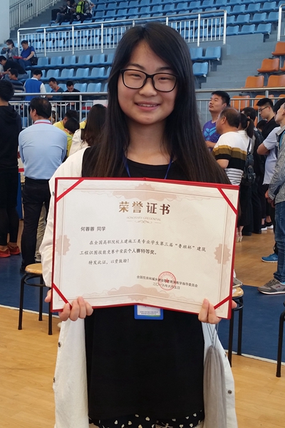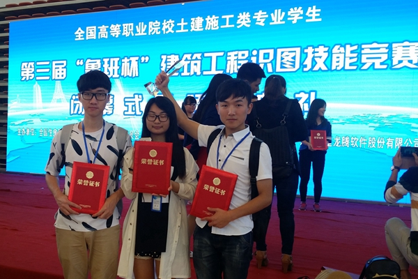 6月3日至5日,由全国住房和城乡建设职业教育教学指导委员会主办、青岛酒店管理职业技术学院承办的全国高等职业院校土建施工类专业学生第三届“鲁班杯”建筑工程识图技能竞赛在青岛隆重举行。在吕文晓、董贵平、沈先荣三位老师的精心指导下,我校建工1402班何蓉蓉同学获得了本次大赛个人特等奖, 建经1401班钱东冬同学获得了个人一等奖, 建经1401班王富龙同学获得了个人二等奖。我校还获得了大赛团体一等奖,吕文晓、董贵平、沈先荣老师分别获得优秀指导教师奖。