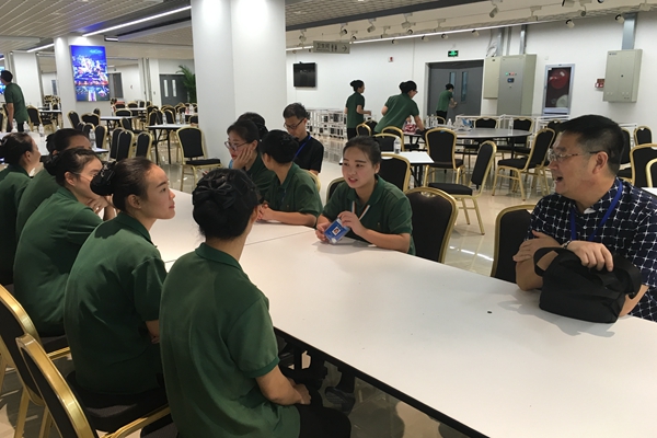 何树贵一行受到了国家会议中心总经理、杭州国际博览中心总经理刘海莹,杭州国际博览中心人力资源部经理黄健及杭州国际博览中心人力资源部培训主管何敏榕等的热情接待。在刘海莹等的陪同下,何树贵一行到大堂吧、媒体用餐区等学生实习工作岗位与同学们座谈。何树贵详细了解了同学们的实习培训与生活情况,并表示,能参与G20峰会这样高端的国际会议的服务接待工作,既是机会,更是挑战。他勉励大家认真学习,刻苦训练,以优雅靓丽的形象、准确流利的语言、熟练扎实的技能做好G20峰会的服务工作,并积极向世界各地的友人传播杭州文化,讲好中国故事。