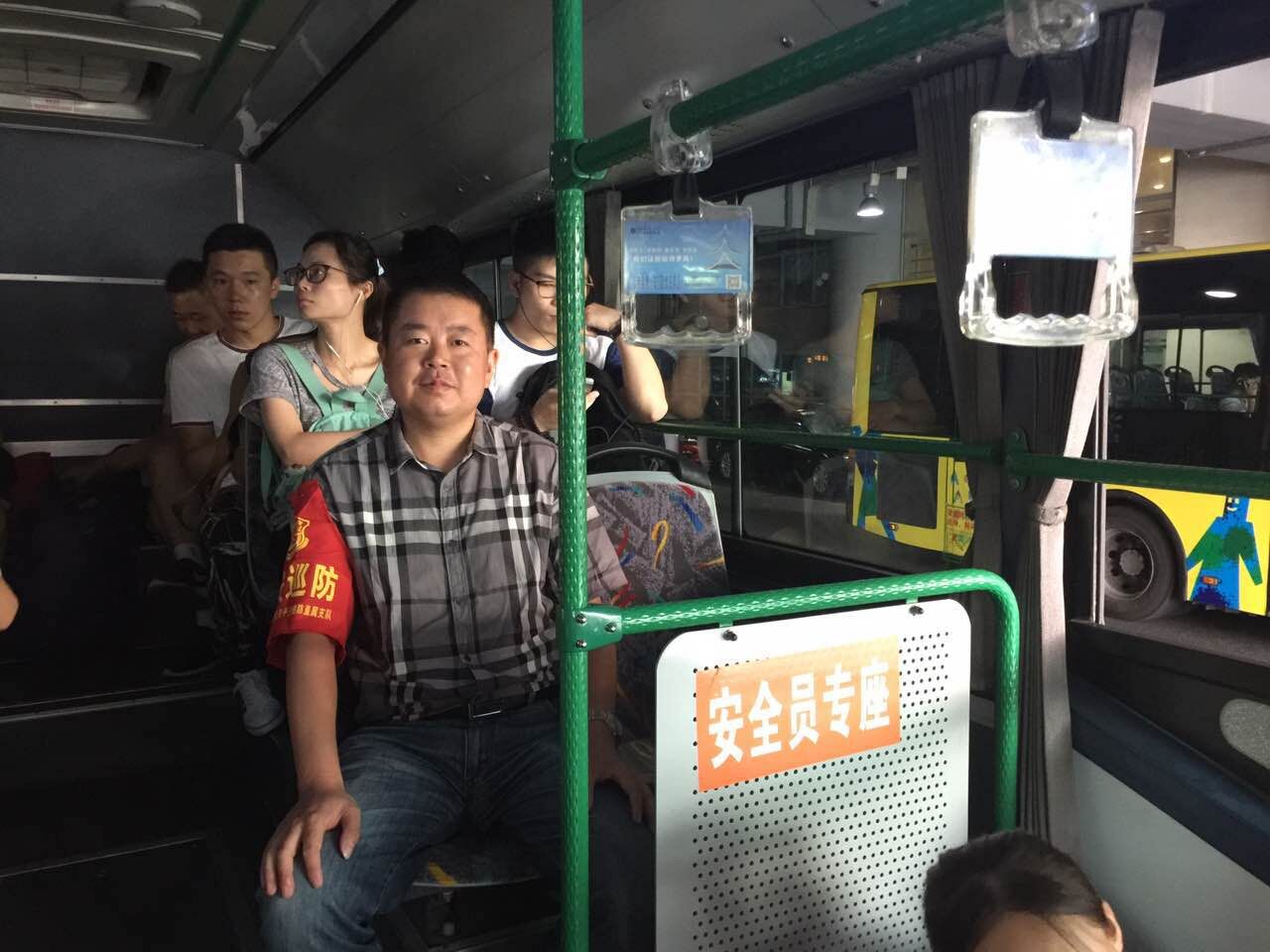 公交安保志愿队服务的是179路公交车,从早上七点开始,志愿者们每人跟着一辆公交车从火车东站西到汽车西站循环往返,一直工作到下午一点。“我们的主要工作是配合司机对每位上车的乘客进行安全检查,同时要关注车内情况,一旦发现问题就要马上做出应急反应,”志愿队负责人白峰介绍说,“公交车的后排设置了安全员专座,因为后排位置高,视野好,方便我们观察车内的情况。”