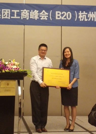 9月19日下午,我校作为杭州洲际酒店(杭州国际会议中心)服务B20峰会的主要合作院校之一,受邀参加酒店举办的“B20峰会杭州洲际酒店员工答谢会”。杭州国际会议中心总经理、钱投集团G20工作部部长陈晓女士在答谢会上赠予谢列卫校长“B20保障优秀合作院校”的牌匾。