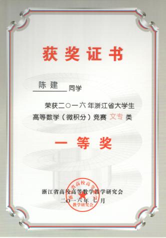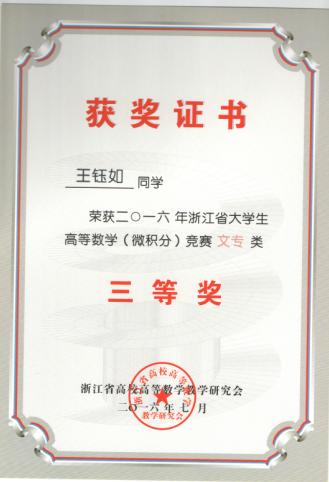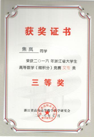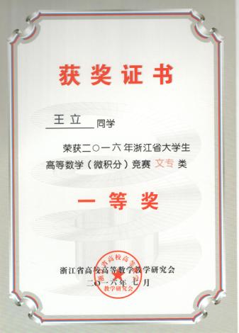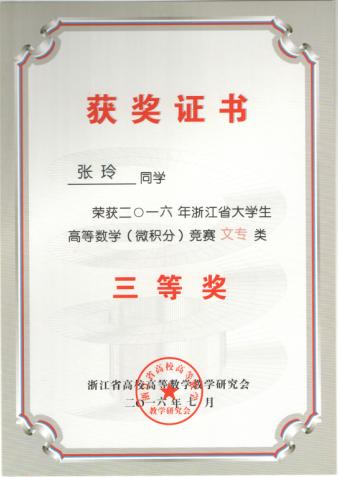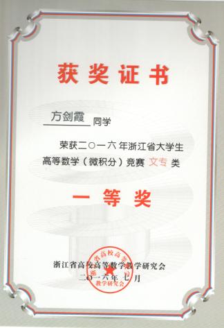 近日,2016年浙江省大学生高等数学竞赛成绩揭晓。在公共教学部胡桐春、潘晓萍和葛建国三位老师的指导下,我校城市建设学院房产1402班陈建、造价1502班王立、建经1402班方剑霞等3位同学分别荣获文专类一等奖,机电工程学院机电1401班张玲、董剑瑶、焦岚三位同学和城市建设学院建经1402王钰如等4位同学分别获得文专类三等奖。这是我校连续第四年获省大学生高等数学竞赛一等奖,也是一等奖获奖人数最多的一次。今年我校一等奖获奖人数在省高职院校中名列前茅。