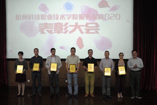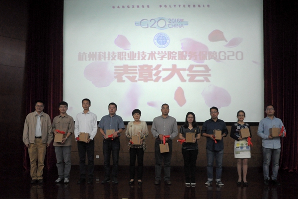 徐红副校长宣读了我校G20杭州峰会服务保障工作表彰文件。校党委宣传部、党委组织部、保卫处、网络信息中心、校团委、旅游学院、教育学院等7个部门(二级学院)获得“校服务保障G20先进集体”称号。校领导们还为获奖师生代表颁发了纪念证书和纪念品。