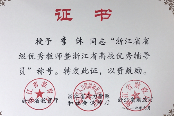 2016年10月26日至27日,第七届浙江省高校辅导员工作论坛暨省优秀辅导员工作研讨会在舟山浙江海洋大学举行。会上,与会领导为我校教育学院李沐老师及其他106名省优辅导员颁发了浙江省优秀教师暨省优辅导员荣誉证书。