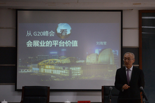 聘任仪式后,刘海莹教授为与会人员作了题为“从G20峰会看会展业的平台价值”的专题讲座。刘海莹教授讲述了会展业为政治、经济、社会发展所起的作用与价值,阐述了正在形成“创新、活力、联动、包容”的会展格局。他以G20峰会为例,详细讲解了餐饮安排、会场布置、人力资源、安保措施等方面的工作标准与工作措施。