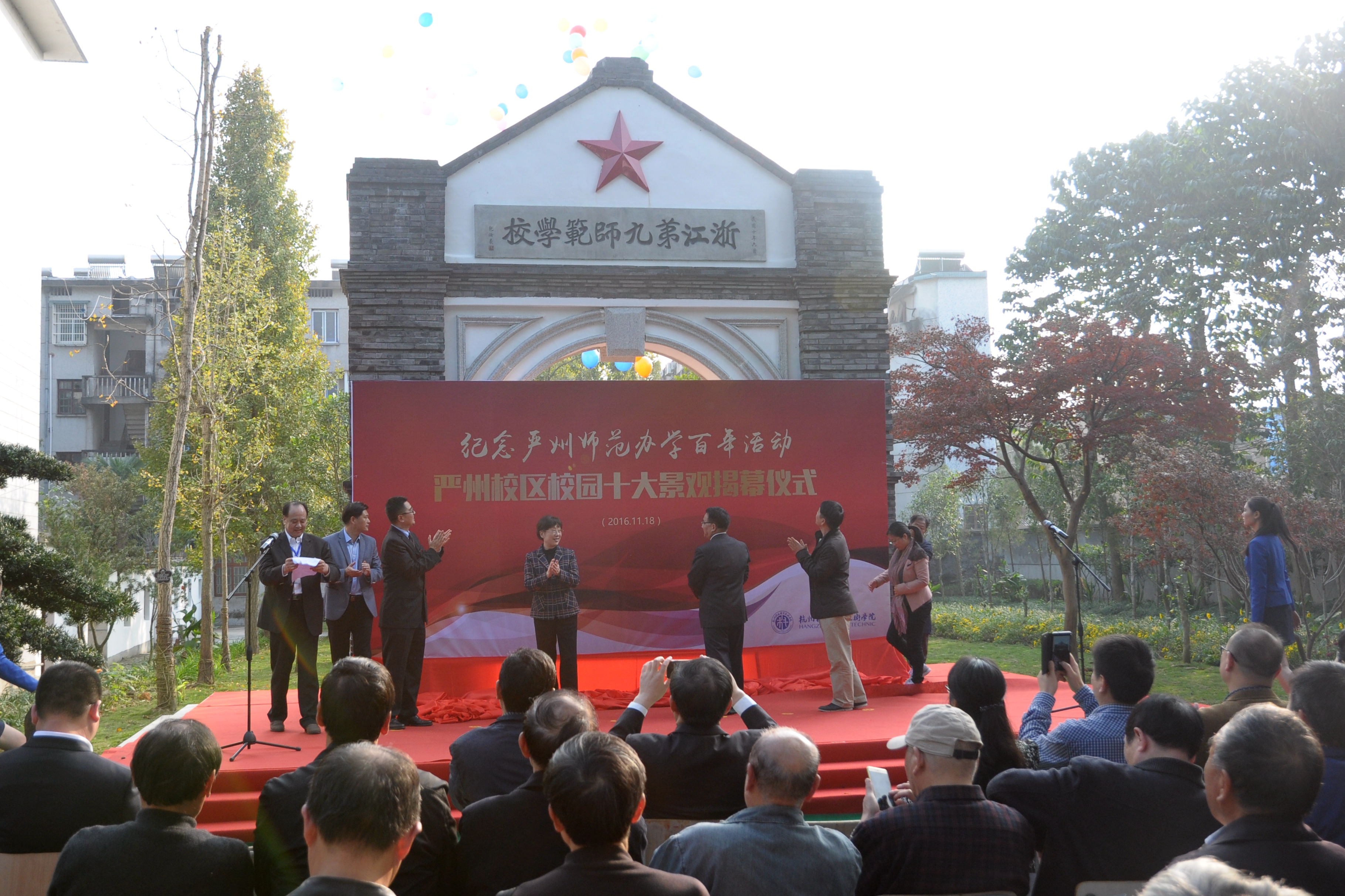 下午2:30,我校又在建德严州校区举行校园十大文化景观揭幕仪式。杭州市人大常委会副主任徐苏宾,建德市人民政府副市长祝军,建德市教育局党委书记、局长郑志华以及建德市梅城镇领导、我校全体领导班子成员、中层干部、校友校友代表、师生代表等300余人参加仪式。我校谢列卫校长、建德市祝军副市长在揭幕仪式上致辞。我校党委副书记张小红主持仪式。
