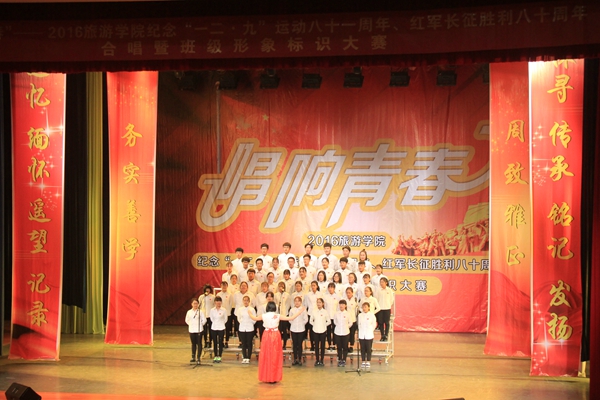 旅游学院从2013年开始连续举办“唱响青春”纪念一二•九运动合唱比赛,比赛覆盖每年大一全体新生,累计参与人数近1700人次。每年11月,旅游学院排练合唱的歌声就会回荡在校园的角落,一首首经典的爱国主义歌曲渐渐被年轻人所熟知、所传唱,就像最近的2016合唱大赛结束后一位学生发的朋友圈所写的那样:一首《强军战歌》让我对那年那月的那些英雄,有了更切近的认识。