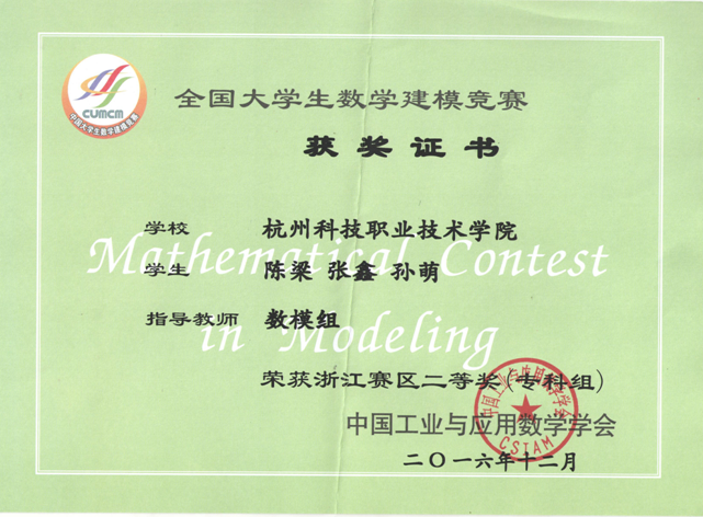 近日,2016年全国大学生数学建模竞赛成绩揭晓。我校城市建设学院房地产经营与估价1401班陈建、建筑工程技术1402班俞佳威、建筑经济管理1402班方剑霞3名同学组成的参赛队在竞赛中发挥出色,荣获全国大学生数学建模竞赛一等奖。由城市建设学院建筑工程技术1401班陈梁、工程造价1501班孙萌、工商学院会计1503班张鑫3名同学组成的参赛队获得浙江赛区二等奖。竞赛指导团队由公共教学部胡桐春、潘晓萍、葛建国和潘厚勇四位老师组成。