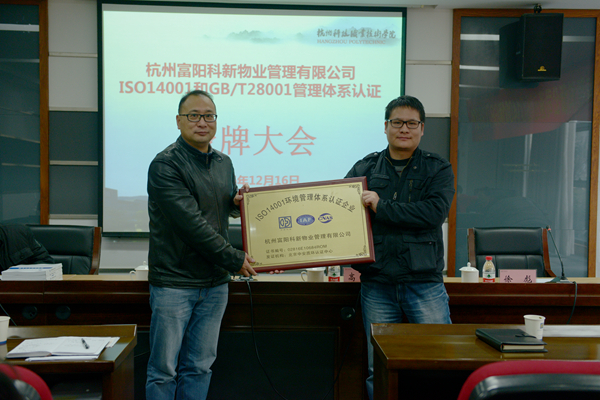 2016年12月16日,科新公司在综合楼2109会议室举行ISO14001环境管理体系GB/T28001职业健康管理体系认证授牌仪式。副校长袁俊代表学校接受北京中安质环认证公司授牌。科新公司负责人及公司相关人员50余人参加了授牌仪式。