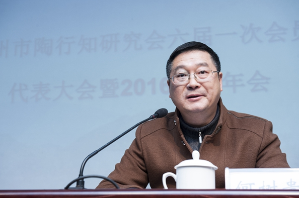 何树贵作杭州市陶行知研究会第五届理事会工作报告。他全面总结了五年来市陶研会在学术年会、社科普及、编辑《杭州陶研通讯》、完善陶馆建设、开展专题活动等方面的取得的成绩。