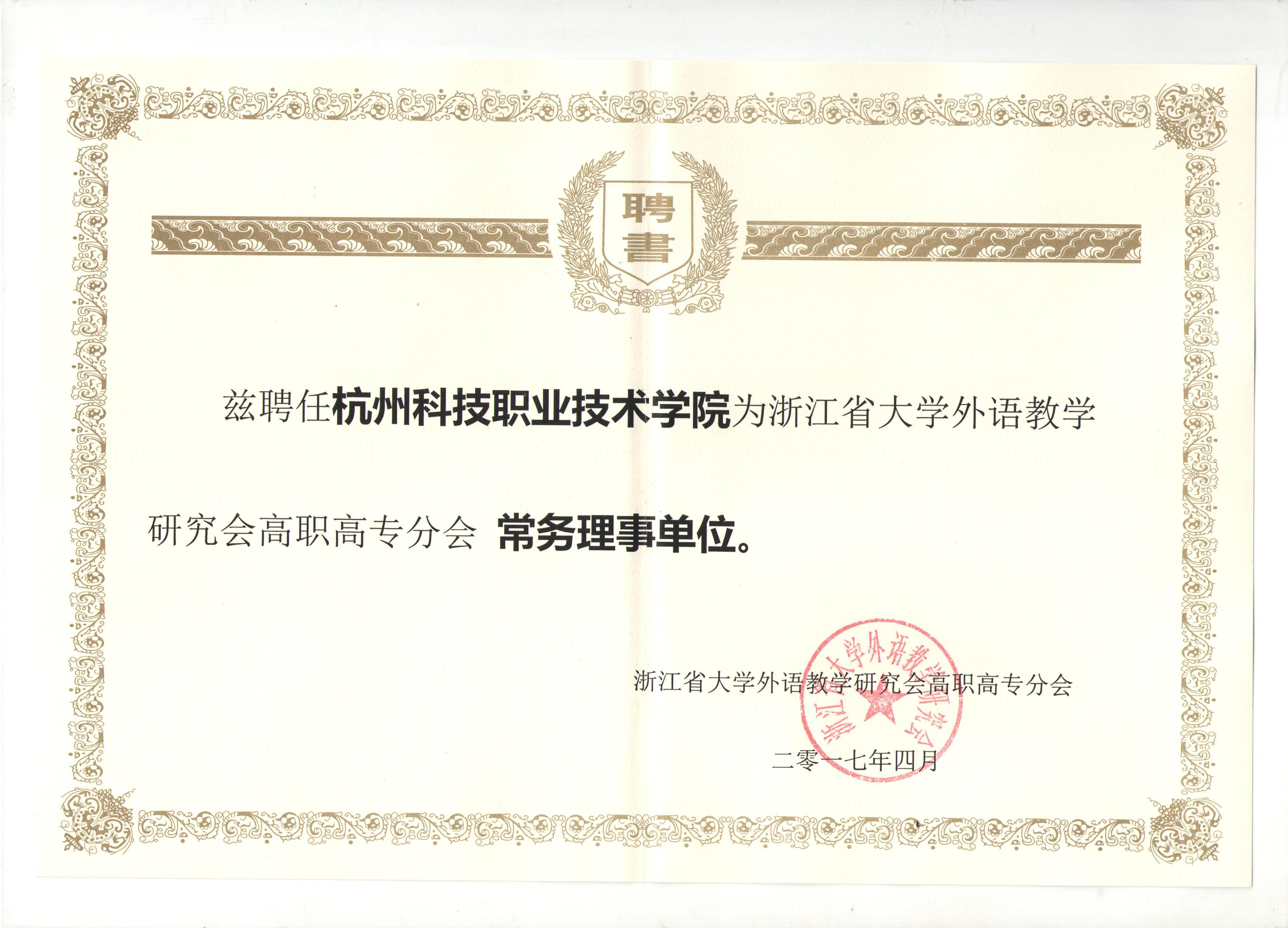 4月26日至28日,浙江省大学外语教学研究会高职高专分会2017年会、常务理事会议在嘉兴南洋职业技术学院举行。经常务理事会议研究决定,我校入选为常务理事单位,公共教学部副主任傅华世被聘为常务理事。