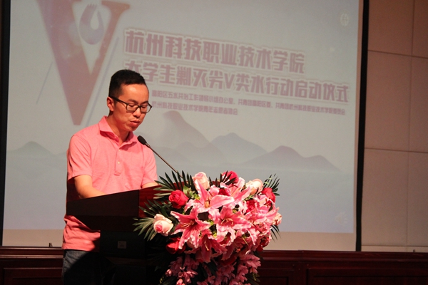 5月26日下午,“青春担当河小二 杭科学子巡富春”我校大学生剿灭劣Ⅴ类水行动启动仪式在陶研馆报告厅顺利举行。富阳区五水共治办常务副主任何郁芳、业务科副科长周剑锋、宣传科副科长蒋倩,富阳区团委书记毛超彦,我校学生处处长汪灿祥、团委副书记周俊炯、宣传部宣传科科长钱伟,校青年志愿者协会招募的100名杭科院“河小二”志愿者参加了启动仪式。