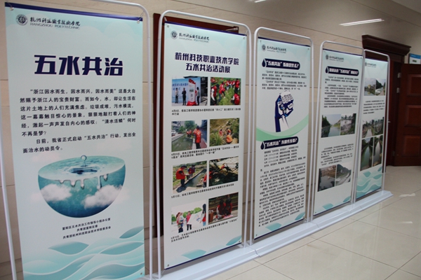 仪式开始前,嘉宾、老师和志愿者们一起参观了在校陶研馆举办的“杭科院五水共治宣传展”。