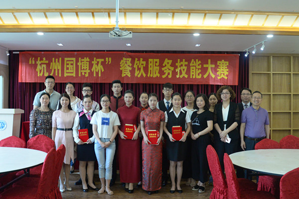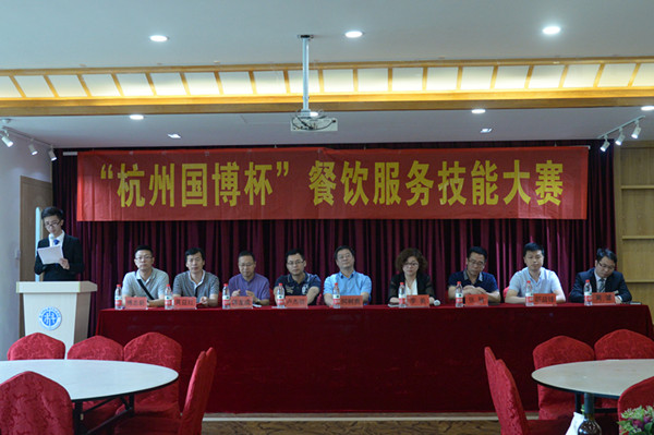 近日,由旅游学院主办、旅游学院蓝羚工作室承办、杭州国际博览中心冠名赞助的 “杭州国博杯”餐饮服务技能大赛在旅游学院餐饮宴会实训室举行。副校长何树贵,杭州国际博览中心副总经理李美,我校教务处、产学研处,旅游学院负责人,新安江职业中学党总支书记黄益红,萧山区第二中等职业学校副校长邵益锋等到现场观看比赛。