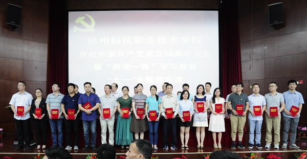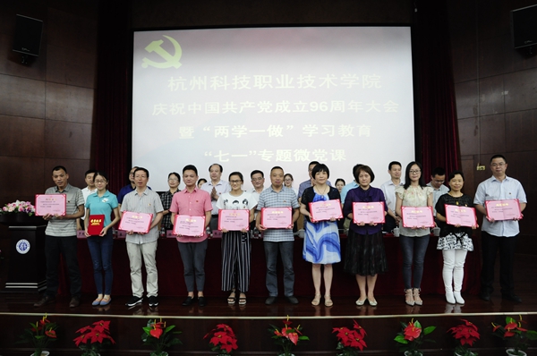 党委副书记张小红宣读了《中国共产党新疆维吾尔自治区委员会 自治区人民政府关于表彰第八批省市援疆工作先进集体和优秀个人的决定》、《中共杭州市委教育工作委员会关于表彰先进基层党组织、优秀党务工作者、优秀共产党员的通知》、《关于表彰2016年度校先进基层党组织、优秀共产党员和优秀党务工作者的决定》等表彰文件。信息工程学院刘昀同志荣获“第八批省市优秀援疆干部人才”称号,并记功一次;旅游学院刘雯同志荣获第三届全省高校微型党课大赛二等奖;机电工程学院党总支等11个党支部被授予“先进基层党组织”荣誉称号,钱伟等23位党员被评为“优秀共产党员”,陈龙等15位同志被评为“优秀党务工作者”。