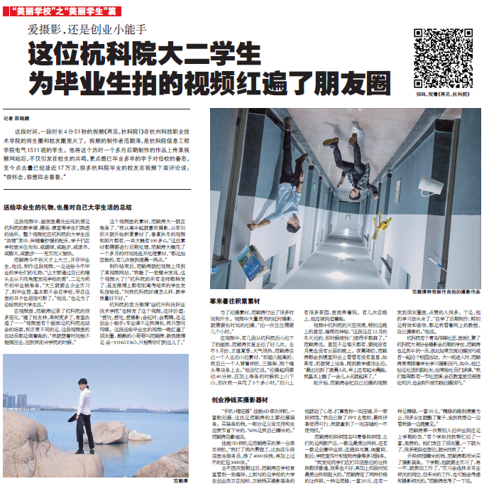 制作结束后,范颖涛就把视频上传到了某视频网站,“我睡了一觉醒来发现,这个视频火了!”杭科院的所有老师都转发了,甚至微博上都有刚高考结束的学生发私信给他,“问我杭科院环境怎么样,教学质量好不好。”