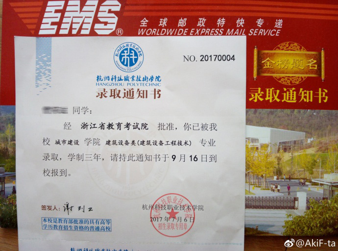 手持杭科车票,踏上杭科幸福列车。我校普通类第三段录取通知书将于8月10日通过EMS邮政特快寄出,快递运单号已公布,预计8月13日前考生将陆续收到录取通知书。2017年艺术类、普通类第二段和五年制高职“3+2”录取通知书均已寄发完毕。9月15日、16日,杭科院校园将热诚欢迎各位新生的到来。