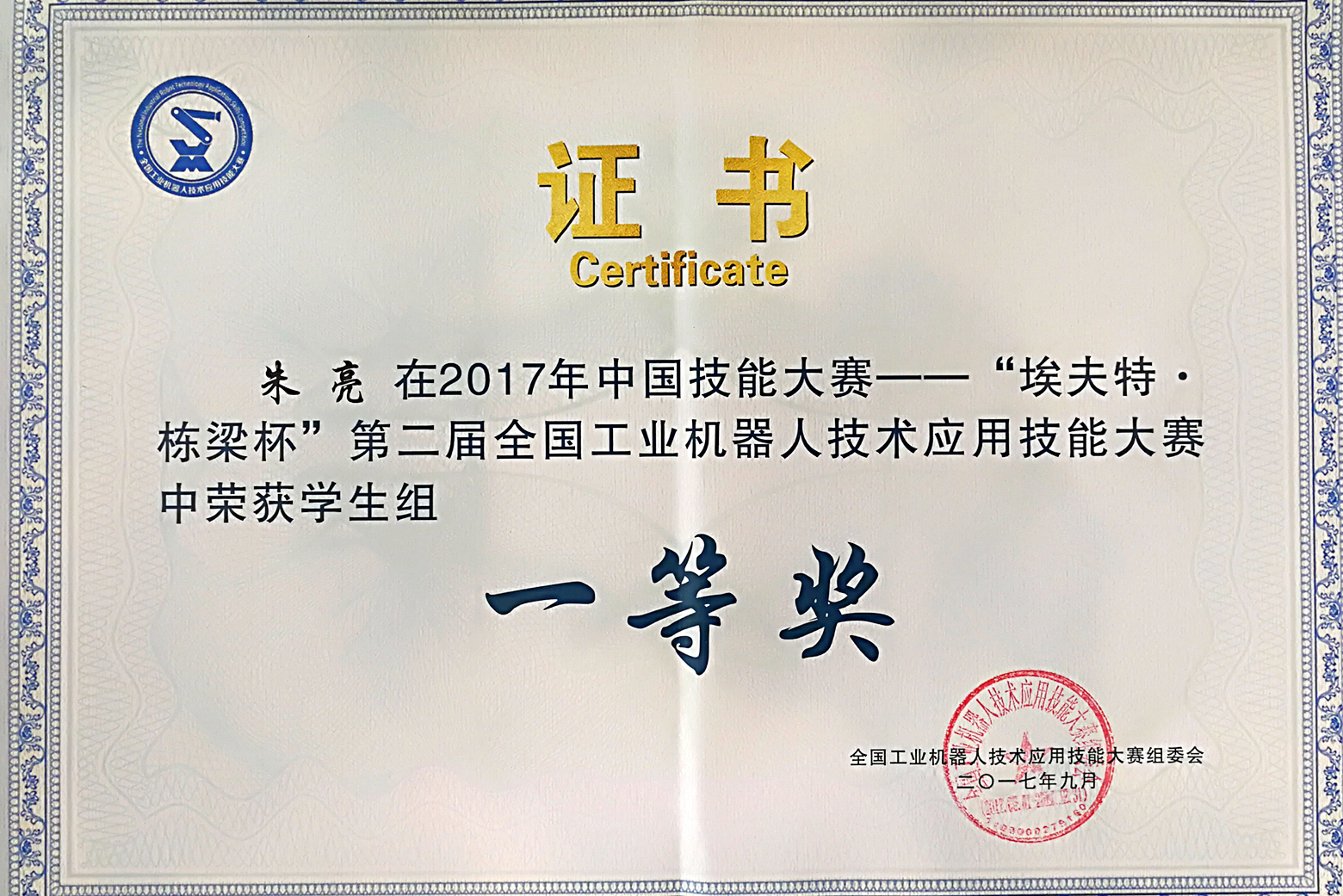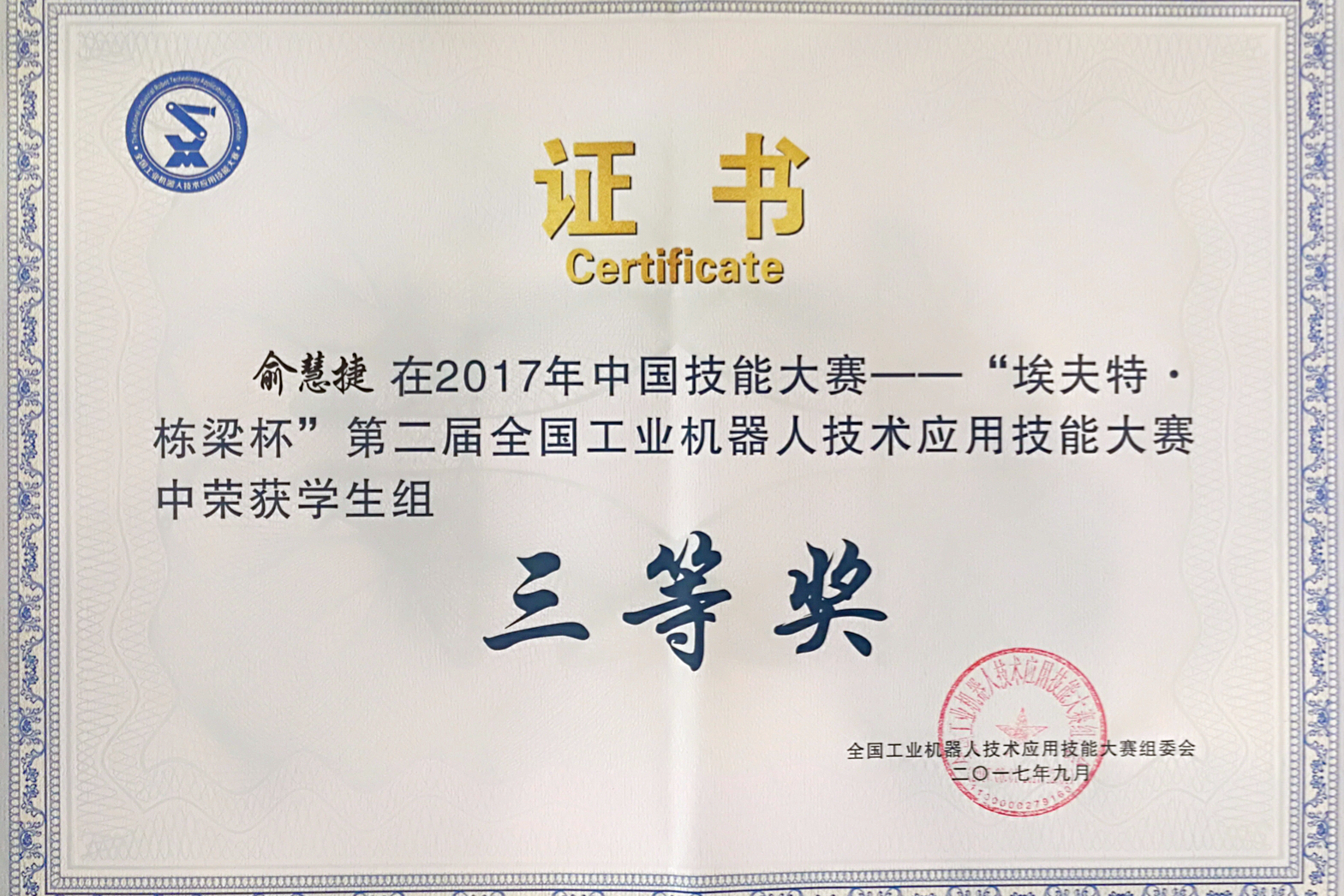 9月7日至10日, 2017年中国技能大赛第二届全国工业机器人技术应用技能大赛决赛在安徽芜湖举行。我校机电工程学院机电一体化技术专业的朱亮、俞慧捷同学代表浙江省参赛,经过10个小时的激烈比拼,他们分别荣获大赛学生组一等奖和三等奖。指导教师羊荣金获得了大赛组委会颁发的“优秀指导教师”荣誉证书。