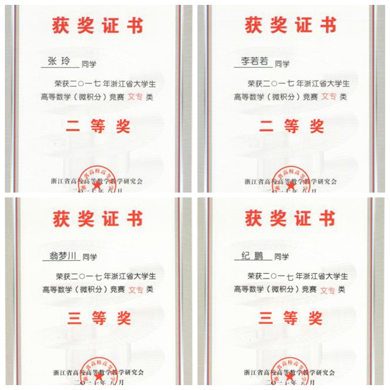近日,2017年浙江省大学生高等数学竞赛成绩揭晓,我校城建学院王立、陈建、方剑霞、林子扬等同学荣获文专类一等奖,机电工程学院张玲、城建学院李若若荣获文专类二等奖,旅游学院翁梦川、城建学院纪鹏荣获文专类三等奖。这是我校连续第五年获浙江省大学生高等数学竞赛一等奖,获一等奖人数也再创新高。此次竞赛的指导老师是公共教学部胡桐春、潘晓萍和葛建国三位老师。