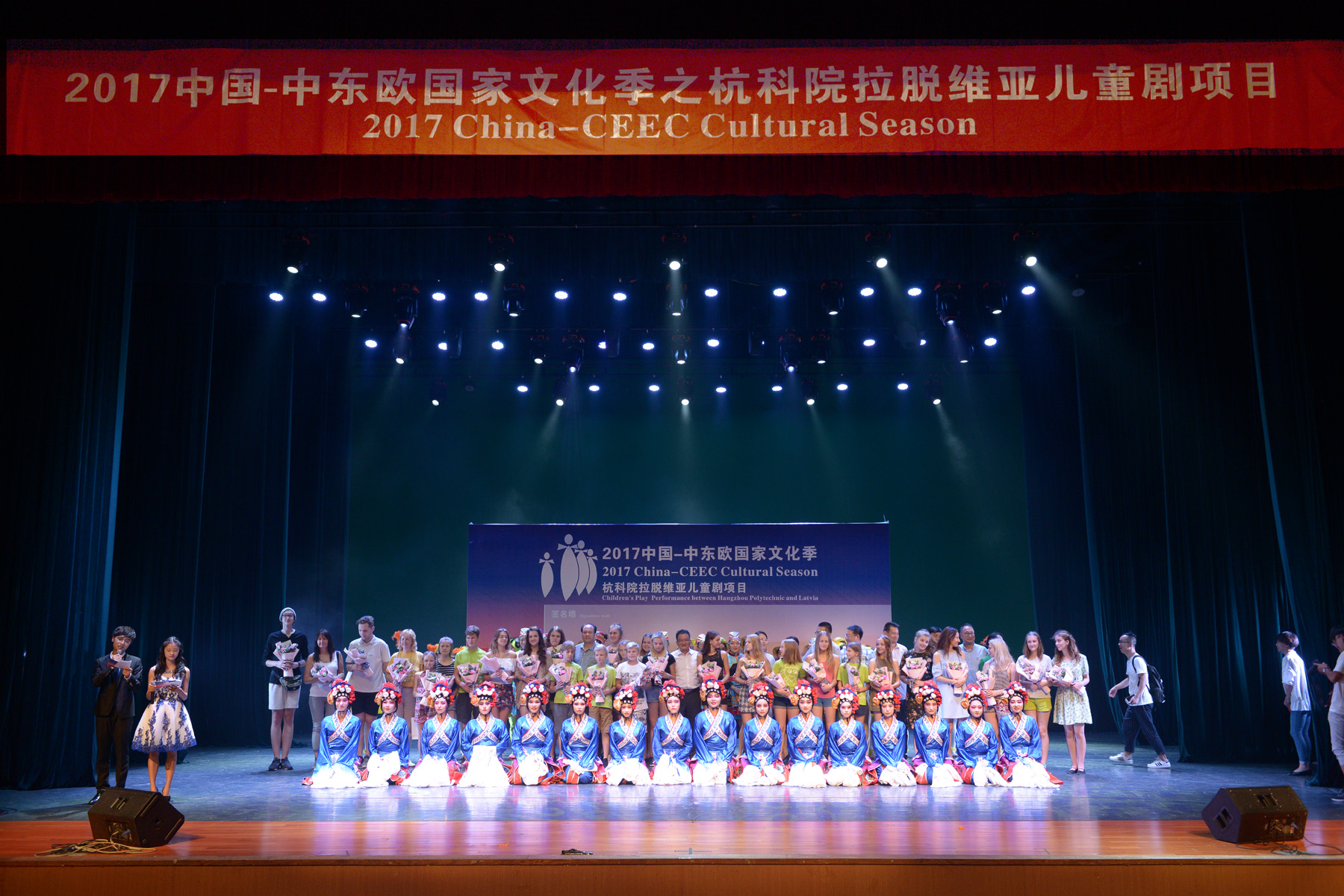 9月26日,由国家文化部主办,我校承办的“2017中国—中东欧国家文化季之杭科院拉脱维亚儿童剧项目”在我校文体中心大剧场隆重举行。来自拉脱维亚ZILUKS剧院的30位青少年演员演绎了经典儿童剧《Spriditis》,用他们的精彩表演展示了中东欧的特色文化。儿童剧演出结束后,我校大学生艺术团、教育学院的学生们献演了具有浓郁中华传统特色和浓郁民族风情的古筝演奏和歌舞节目。杭州市副市长陈红英、市政府副秘书长杨建华、市文广新局副局长李一青,我校全体校领导与近千名杭科院师生、富阳区市民代表一同现场观看演出。超过1万人通过我校官方微信直播平台在线观看演出。演出结束后,陈红英副市长与来自拉脱维亚的演员们亲切握手,并送上了鲜花和礼物。