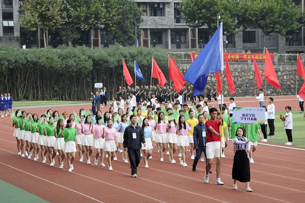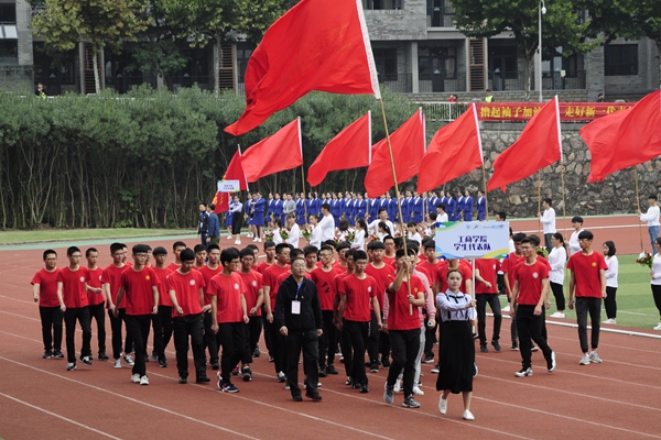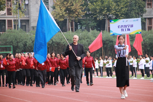 在激昂的运动员进行曲中,护旗手迈着有力的步伐护送五星红旗和校运动会会旗步入田径场,师生代表队喊着响亮的口号队依次走过主席台,外籍教师们也加入了公共教学部代表队。