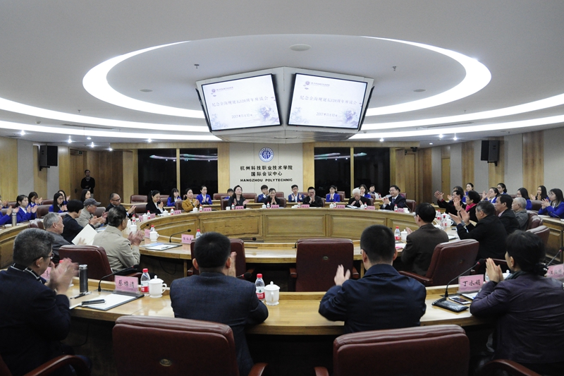 11月10日,我校在高桥校区举行纪念金海观诞辰120周年座谈会暨金海观纪念室揭牌仪式,民进浙江省委会秘书长姜红雨、民进杭州市委会秘书长诸剑超、民进萧山区委会副主委陈丽君,原浙江历史学会会长、浙江大学博导金普森,我校校长谢列卫、副校长何树贵,校党委委员、组织部部长赵悦林,校党委委员、宣传部部长罗明誉,原湘湖师范学校校长阙沛霖,原萧山区金海观研究会会长韩成兴等出席座谈会和揭牌仪式。金海观先生儿子金陵给大会发来了贺信。原湘湖师范校友会代表、原金海观研究会代表、抗战时期湘师南迁办学点代表、金海观故乡代表以及我校师生代表等近80人参加了座谈会和揭牌仪式。