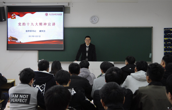 谢列卫说,大学生思政工作不是思政课堂的事,不是思政老师的事,而是全校、全社会都要参与的系统工程,“校园里的每一天都可以是教育,校园里的每一个人都可以是老师。”而杭科院党委班子的其余八位成员,近期也陆续深入课堂为学生宣讲十九大精神,全校七个高职二级学院全覆盖。在党委带动下,各党总支、党支部也将启动宣讲工作,在全校形成学习宣传贯彻十九大精神的新高潮。