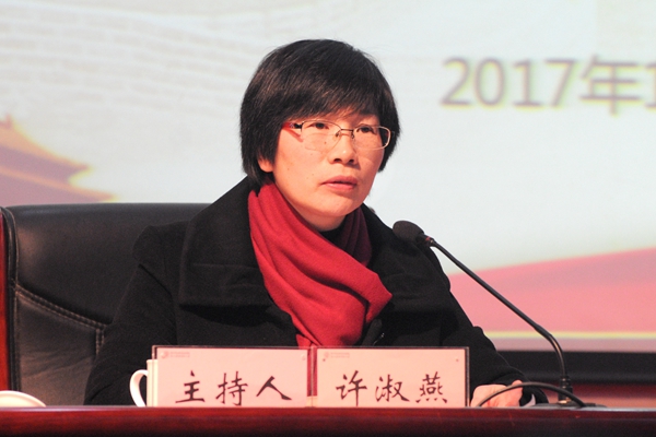 《以党的十九大为引领,筹备开好学校首次党代会》,12月15日下午,校党委书记谢列卫以此为题,为全体校级领导,全体中层干部(含原调研员),各党总支委员、党支部书记,全体学生辅导员上主题党课。党课由党委副书记、校长许淑燕主持。