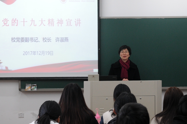 党委副书记、校长许淑燕从南京大屠杀80周年公祭说起,用今夕对比的历史事实,开宗明义地向艺术设计学院建装1602班的同学们讲清了“落后就要挨打”、国家必须强盛的道理。许淑燕从开创了新局面、进入了新时代、研判了新矛盾、明确了新使命、形成了新思想、确立了新方略、开启了新征程、强调了新理念、重申了新任务九个方面,为同学们系统讲解了党的十九大精神,并以自己的求学、工作经历为例,鼓励同学们珍惜机会、努力学习,跨界思维、共享资源,创新创业、奉献社会。“浙江是全国改革发展的排头兵,有非常好的发展环境,希望同学们珍惜机会,学好本领,留在杭州工作,为浙江的发展作贡献。”许淑燕说,在校学习专业成绩固然重要,却不是唯一的,“更重要的是能力”。“作为校长,我愿意为大家的成长提供更多的便利条件,为我们的同学做好服务”,许淑燕建议同学们树立起五年、十年及一生的阶段性目标和总目标,“正确认识时代责任和历史使命,正确认识远大抱负和脚踏实地,坚定地朝着自己的目标一步步努力。”