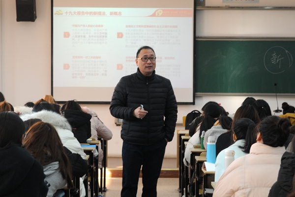 寿伟义副校长用一个谐趣的小段子作引,为教育学院学前1603班、1604班的同学解释了党的领导体系,“党政军学民,东西南北中,党是领导一切的”。寿伟义详细分析了党的十九大的重要历史意义,分析了党和国家目前面临的形势和挑战,并突出新时代、新矛盾、新思想三大核心概念,为同学们原汁原味地讲解了当前所处的历史区位、新形势下新的任务、新时代中国特色社会主义思想和基本方略。“建设教育强国是中华民族伟大复兴的基础工程”,“青年兴则国家兴,青年强则国家强”,寿伟义引述十九大报告原文,鼓励学前教育的同学们,把握时代机遇,为教育事业贡献自己的青春力量。