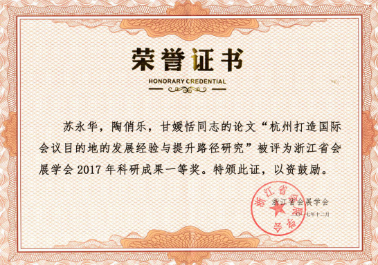 旅游学院苏永华老师获浙江省会展学会2017年科研成果一等奖