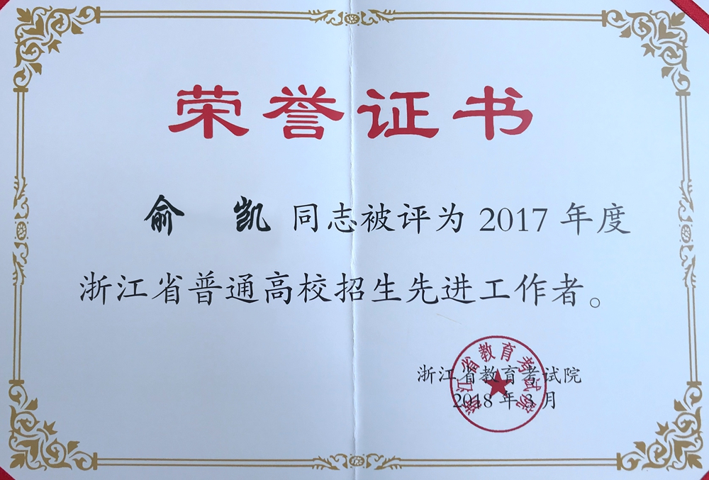 近日,2018年度浙江省考试招生工作会议在省教育考试院召开,会议对2017年度浙江省招生工作先进集体和先进个人进行了表彰,我校招生就业处戴立桥、俞凯两位老师荣获“2017年度浙江省普通高校招生先进工作者”称号。