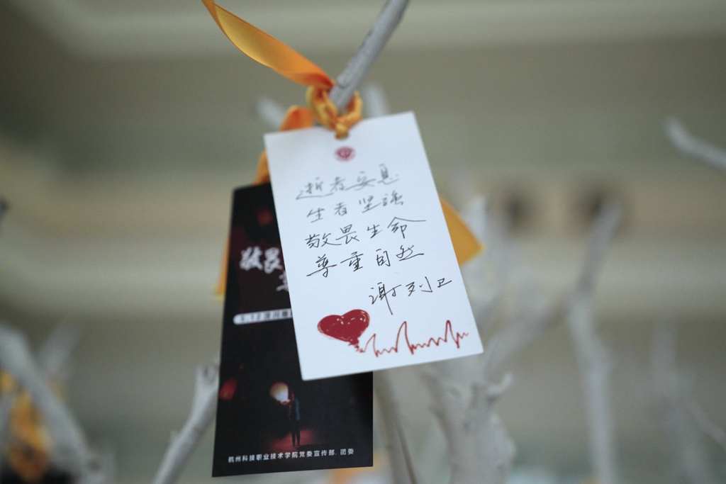 在开展仪式现场,全体参展人员为5.12汶川地震中遇难的同胞及在抗震救灾中献出宝贵生命的英雄默哀三分钟,并在寿伟义副校长的带领下写下祝福语,为希望树系上了代表思念和美好愿望的黄丝带。同时,校“行知之声”广播台的同学带来了诗朗诵《昨天 今天》,用诗歌的形式纪念在汶川中逝去的生命。开展仪式简短而隆重,为同学们带来一堂生动的“生命教育课”。