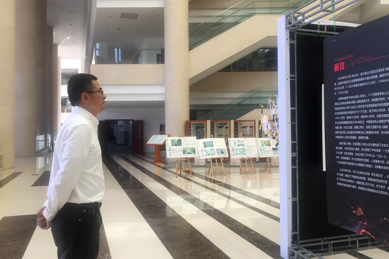 5月11日中午,以“敬畏生命,尊重自然”为主题的杭科院5•12汶川地震纪念展在图书馆大厅开展。副校长寿伟义与党委宣传部、校团委、公共教学部负责人共同参加了本次展出的开展仪式。