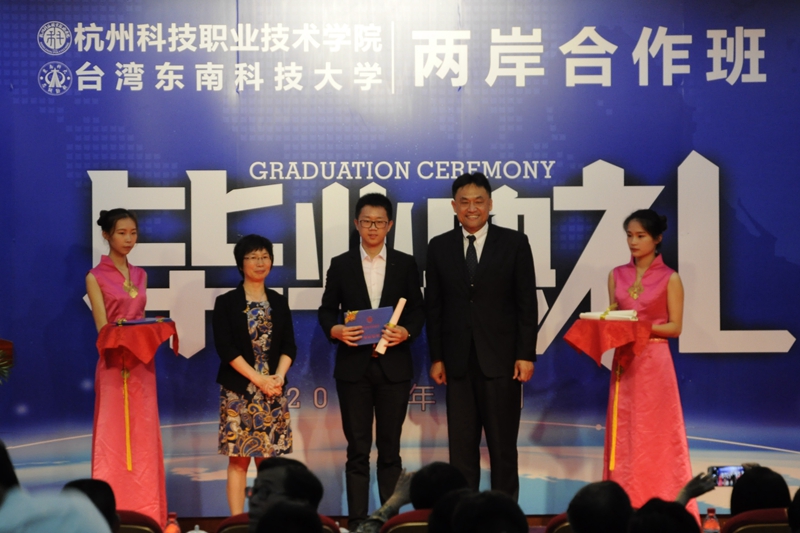 5月22日,我校2018届建筑设备工程技术两岸合作班毕业典礼在陶研馆报告厅举行,杭州市人民政府台湾事务办公室主任梁建华,台湾东南科技大学副校长董益吾、主任秘书孙瑞琴、两岸教育交流中心主任王治邦,我校校长许淑燕、副校长寿伟义出席毕业典礼。近日来我校参加创新创业体验营的台湾东南科技大学师生及我校城市建设学院负责人、相关教师一同参加了毕业典礼。毕业典礼由寿伟义主持。
