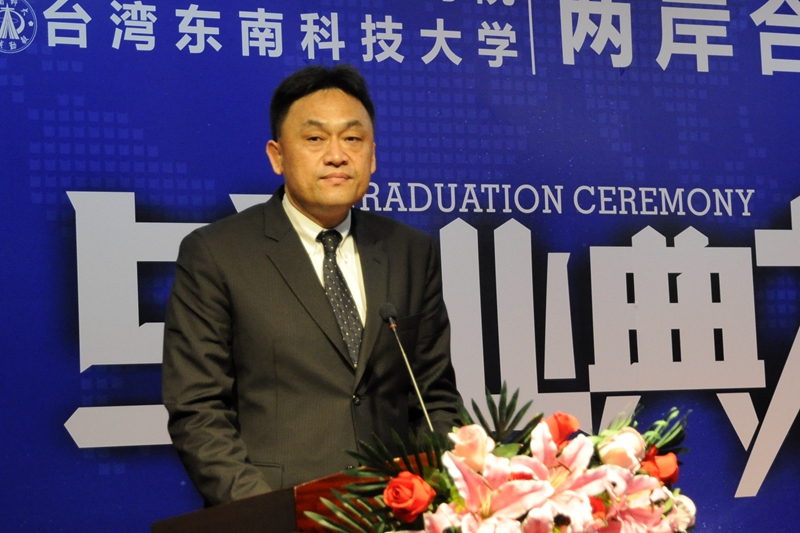 许淑燕代表学校向毕业班的33名同学表示祝贺,她肯定了两岸合作班首届毕业生在校学习的出色表现,认为同学们不仅秉承了杭科院的优良传统,而且了解了台湾的现代职业教育理念和相关的职业技能标准,开阔了视野、增长了知识、提高了能力、增强了素质,并将“感恩、责任、自信、超越”八个字作为临别赠言送给学生,希望大家懂得珍惜、学会感恩,学会做人、担起责任,坚忍不拔、敢于超越。许淑燕回顾了我校与东南科技大学三年来办学合作的历程,两校通过高层互访、师资互派、学生交流等合作形式,共享先进的教育理念和优质教育资源,有效推动了建筑设备工程技术专业和课程建设,有效提升了学生综合素养。许淑燕表示希望今后两校能继续携手共进,深化友谊,共同为两岸教育合作作出新贡献。