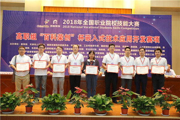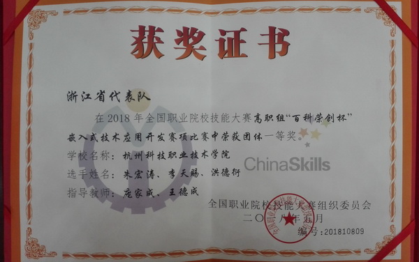5月27日,2018年全国职业院校技能大赛高职组“嵌入式技术应用开发”赛项在西安航空职业技术学院举行,共有来自全国各省市的95支代表队参加了比赛。我校信息工程学院学生朱宏涛、李天赐、洪德衍组成的浙江代表二队在比赛中沉着应战,通力合作,最终获得该赛项一等奖的好成绩,庞家成、王德成老师获大赛“优秀指导教师”称号。