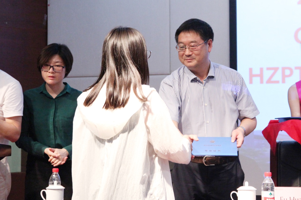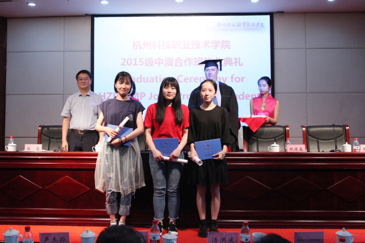 毕业典礼上,何树贵副校长和Dino Bettiol先生分别代表杭州科技职业技术学院和墨尔本理工学院为每一位毕业生颁发了毕业证书和文凭。