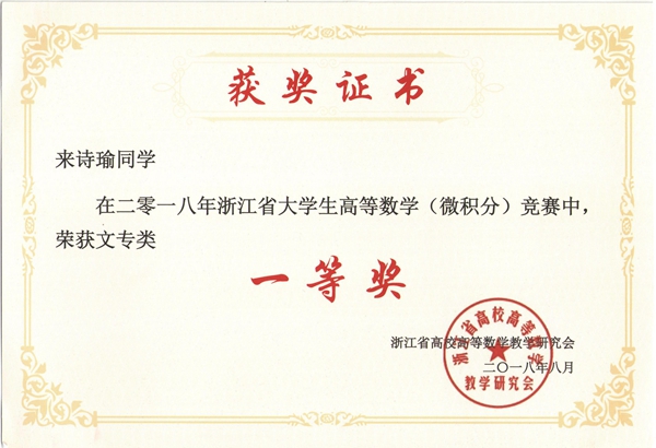 近日,2018年浙江省大学生高等数学竞赛成绩揭晓,我校信息工程学院物联网1701班来诗瑜同学荣获一等奖,城市建设学院建工1602班李森、建工1702班周新意、建工1702班王忻、造价1701班陈帅炯、建工1601班李若若、造价1601班翁哲馨、造价1502王立等7位同学获得二等奖,城市建设学院房产1601班刘雨佳同学获得三等奖。这是我校连续第六年获浙江省大学生高等数学竞赛一等奖,也是历年来同时获奖人数最多的一次。胡桐春、潘晓萍、葛建国三位老师也再度荣获浙江省大学生高等数学竞赛优秀指导教师称号。