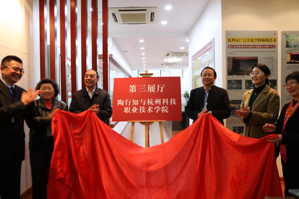 当天下午,周洪宇、陈红英、吕德雄、陶铮、谢列卫、许淑燕共同为我校陶行知纪念馆第三展厅(陶行知与杭州科技职业技术学院)揭牌。该展厅是我校杭州陶行知研究馆的重要组成部分,集中介绍了我校传承陶行知教育思想的高职人才培养典型成果。