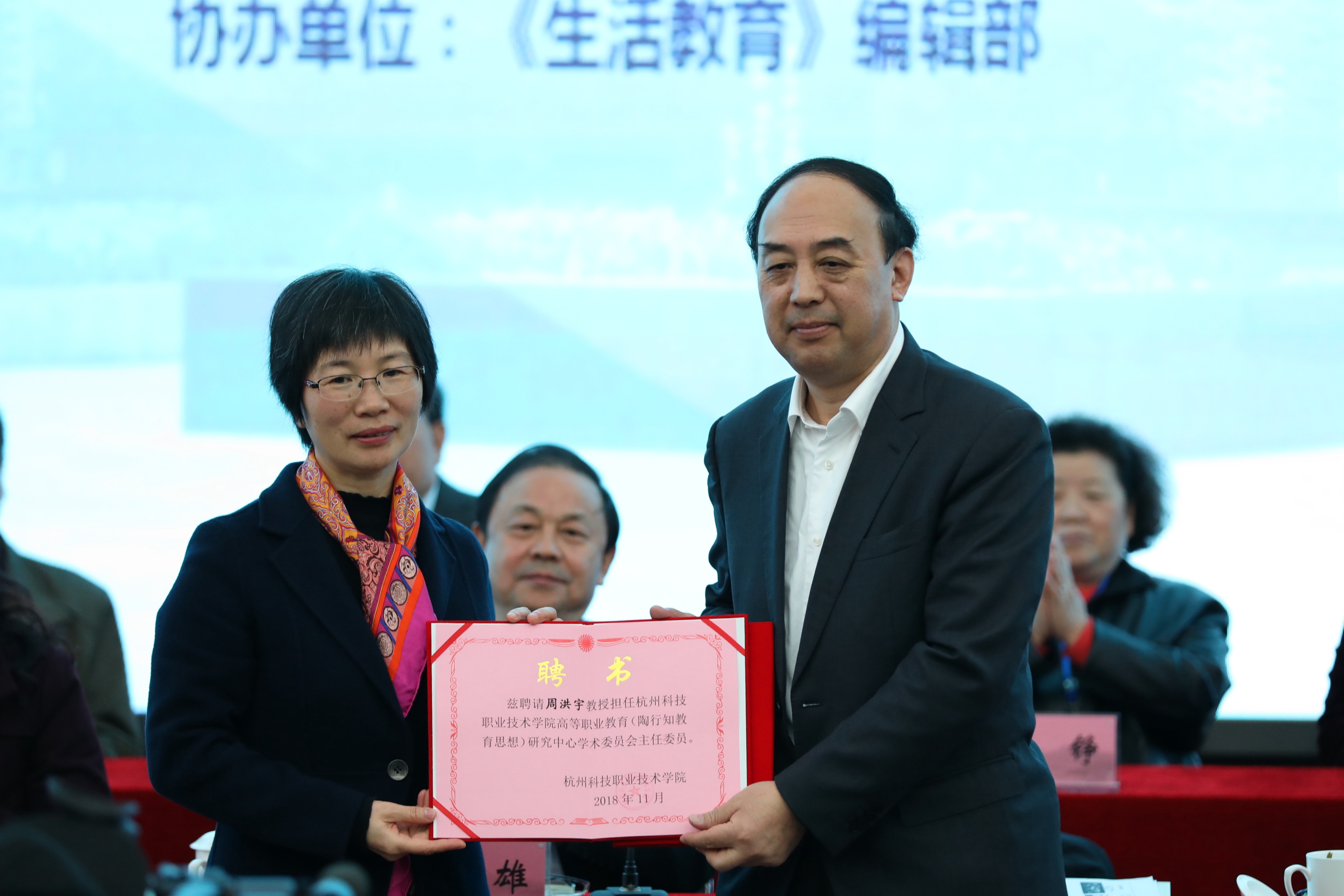 开幕式上,谢列卫、许淑燕代表学校聘请周洪宇教授为我校校园文化总顾问、校高等职业教育(陶行知教育思想)研究中心学术委员会主任委员,并向周洪宇教授颁发了聘书。