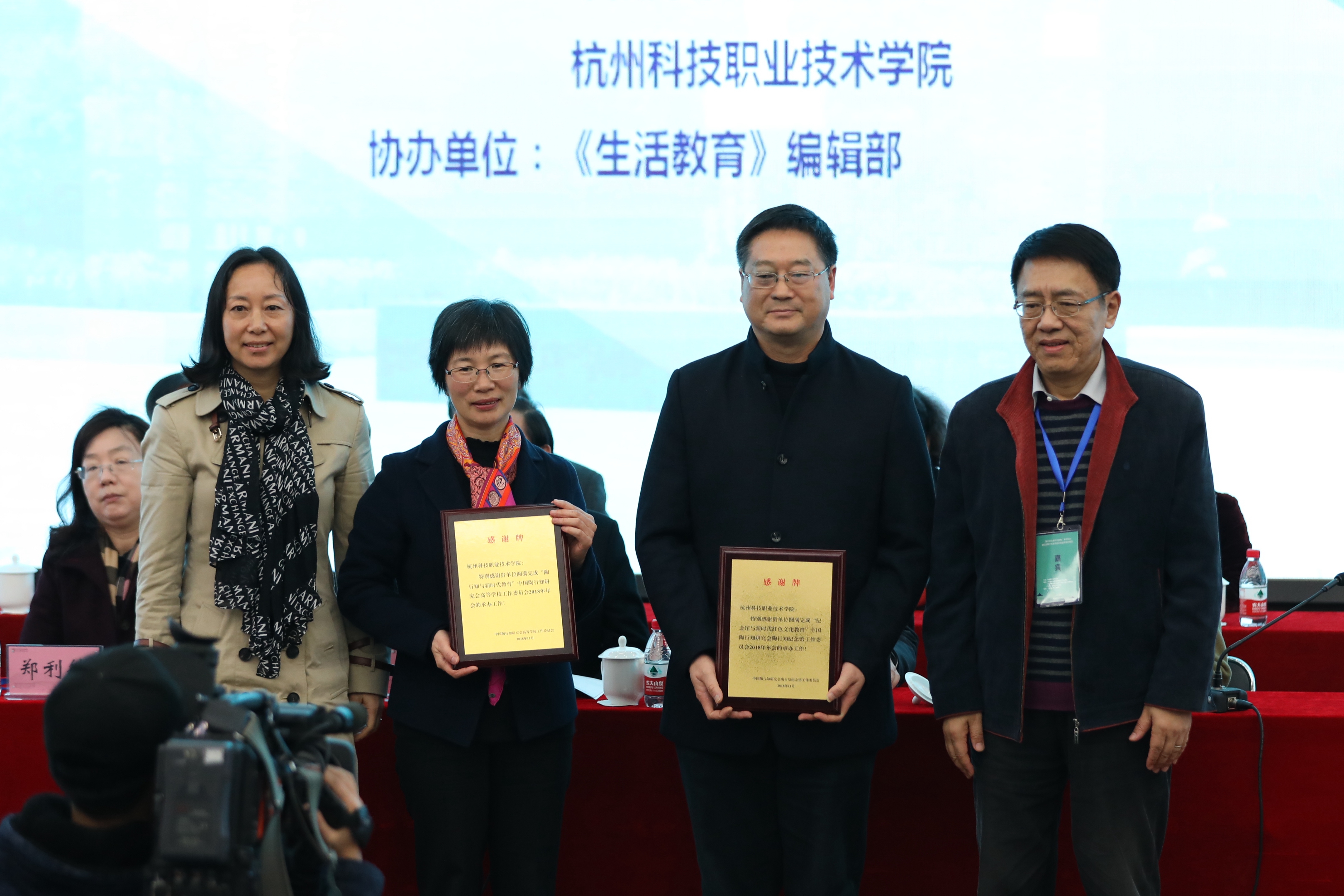 陆建非、陆黎明代表中陶会、高工委和馆工委为我校授感谢牌,对我校承办中国陶行知研究会高工委、陶工委2018年年会给予高度肯定。