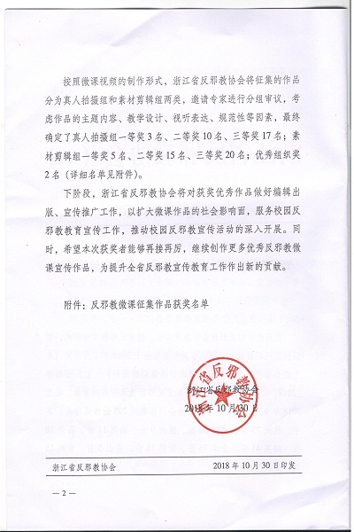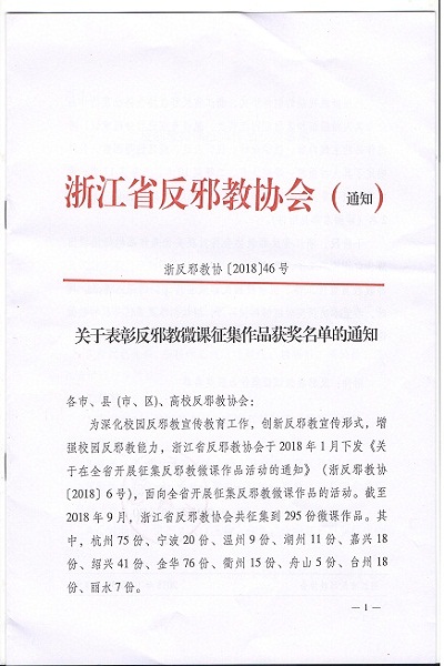 近日,我校信息工程学院周婧旻和胡恩泽老师制作的微课作品《滚蛋吧!邪教瘤——大学生如何防范邪教》在浙江省反邪教协会组织的反邪教作品微课征集活动中荣获真人拍摄组一等奖。