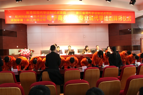 11月22日,我校在陶研馆举行教育部现代学徒制试点项目、浙江省现代学徒制试点项目、杭州科技职业技术学院与东箭集团完整家居(浙江)有限公司合作开展的电子商务技术专业2018年度现代学徒制“天网英才班”拜师仪式和签约仪式。校党委副书记何树贵、完整家居电商事业部总经理余化学先生出席仪式,信息工程学院院长杨悦梅、党总支书记傅联云、教务处副处长陆亚文、产学研合作处副处长洪新军,通过岗前培训考核的首批15名“学徒”,及电子商务专业全体学生100余人参加了仪式。仪式由信息工程学院院长杨悦梅主持。