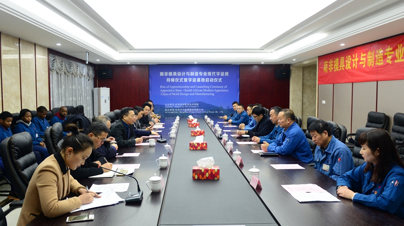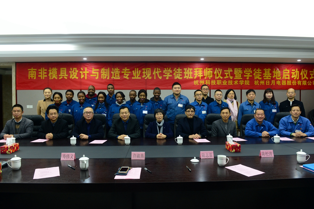 12月6日上午,南非留学生模具设计与制造专业现代学徒班拜师仪式在杭州日月电器股份有限公司举行,校长许淑燕、副校长寿伟义,南非中国文化和国际教育交流中心主任陆志雷、南非中国文化和国际教育交流中心项目负责人陈松涛,杭州日月电器股份有限公司总经理郎飞、总工程师冯小定、总经理王李明、常务副总徐军出席仪式,我校机电工程学院负责人、10位南非留学生和企业师傅等参加了仪式。
