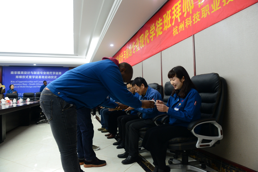 10位南非留学生按照中国文化传统,向杭州日月电器股份有限公司的师傅们鞠躬,行奉茶礼。南非留学生代表维拉卡茨说,能来到中国十分幸运,“校园生活出人意料,这里有世界一流的设备和专业的教师,我们因此获得了最好的教育”。维拉卡茨感谢学校和企业对他们的照顾,并表示自己“找到了一个新家”。